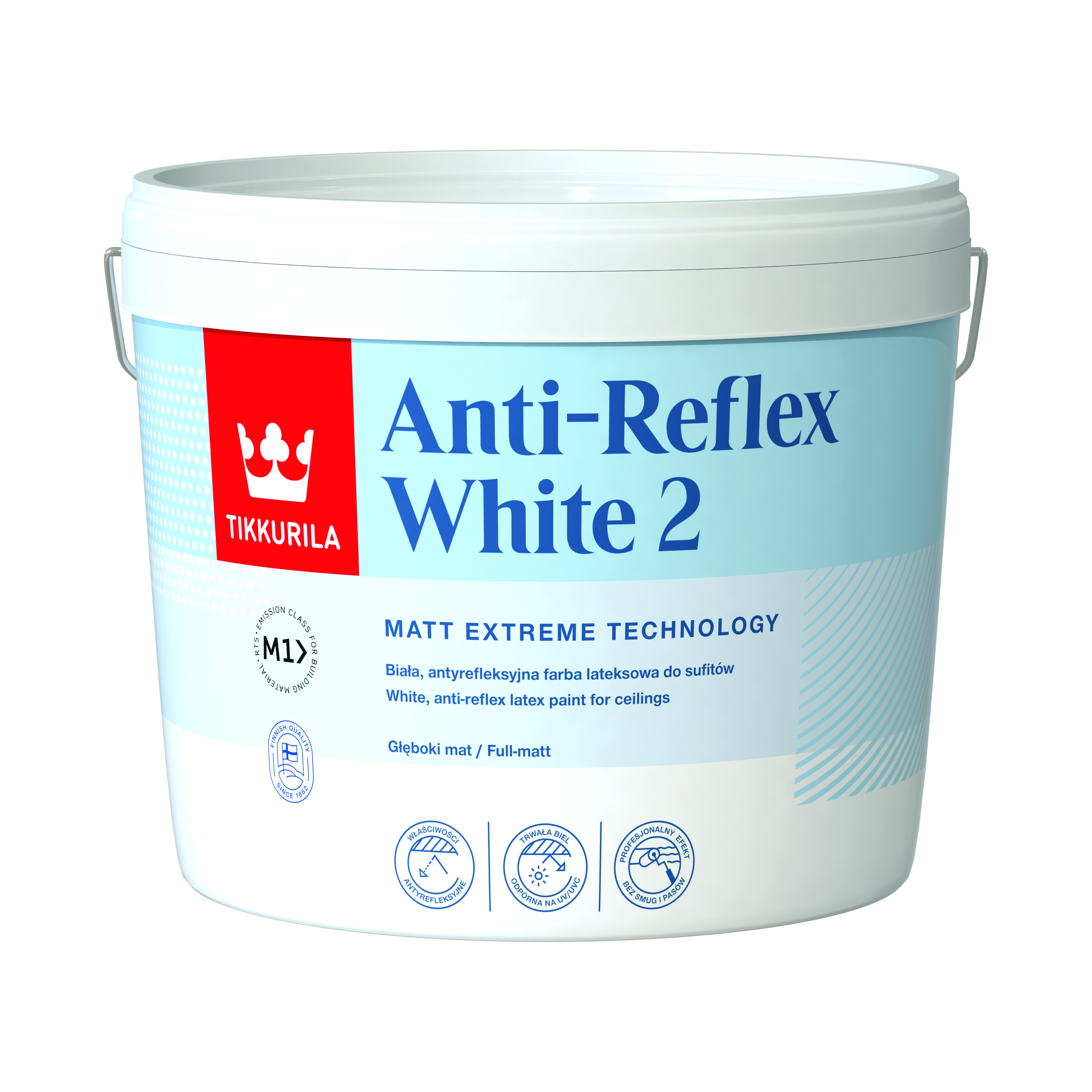 Tikkurila Anti-Reflex White [2] to biała, antyrefleksyjna, wodorozcieńczalna, wysokiej jakości, głęboko matowa farba lateksowa do malowania sufitów wewnątrz pomieszczeń. Dzięki unikatowej kompozycji związków tytanu oraz wypełniaczy funkcyjnych farba niweluje refleksy świetlne wywołujące wrażenie nierówności podłoża. Farba przeznaczona do dekoracyjno-ochronnego malowania sufitów wewnątrz pomieszczeń mieszkalnych, biurowych i użyteczności publicznej, w tym w obiektach szkolno-wychowawczych, służby zdrowia (szpitale, szkoły, przedszkola), zakładach produkcyjnych, także branży spożywczej (bez bezpośredniego kontaktu z żywnością)*. Wydziela neutralny zapach podczas nanoszenia i schnięcia. Tworzy jednolitą głęboko matową powłokę odporną na delikatne przemywanie. * W przypadku dodatkowych wymagań w odniesieniu do możliwości stosowania produktu w w/w obiektach prosimy o kontakt z działem technicznym.
